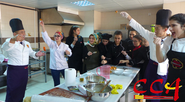 展演团员指导土耳其职业学校师生学习拔丝土豆制作技艺