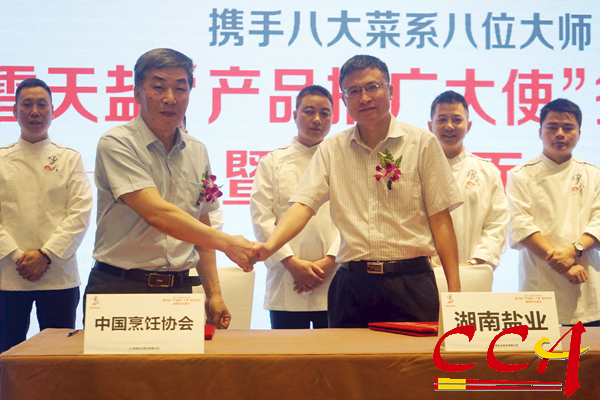 中国烹饪协会副会长乔杰与湖南盐业股份有限公司副总王哈滨现场签约