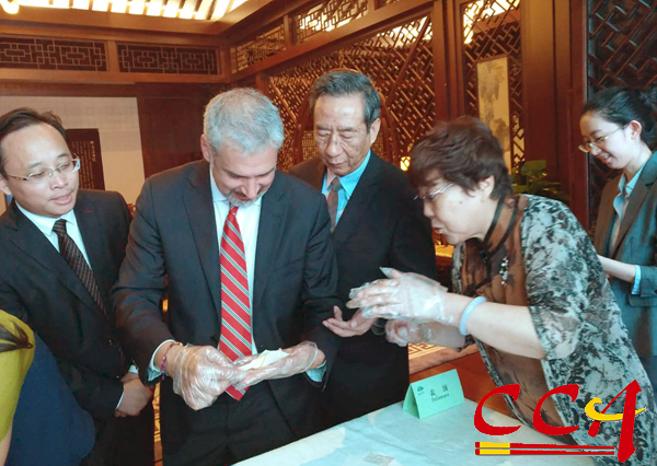期间,高岱明会长为奥托内总干事讲解了淮扬菜发展的历史文化及相关发展情况,声情并茂地介绍了“江淮一品”、“金钩蒲菜”、“蟹黄汤包”、“白炮虾仁盖浇面”等淮扬名菜名点的特色及典故,引起了奥托内总干事的浓厚兴趣。席间的“包淮饺”、“萝卜菊蕊”等技艺展示更是给奥托内总干事留下了深刻印象。对此,他表示,淮安有着丰富的饮食文化底蕴,希望淮扬菜美食文化在世界范围内推广,让更多的人民喜欢中国美食。