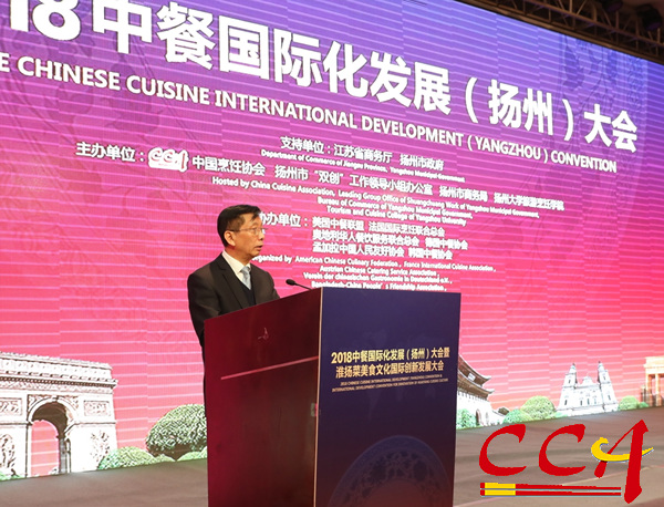 2018中餐国际化发展(扬州)大会暨淮扬菜美食文化国际创新发展大会12月13-16日在扬州举办。中宣部原秘书长官景辉,中国烹饪协会会长姜俊贤,全国政协委员、中国侨联常委潘庆林,中国商业联合会副秘书长马巍,扬州市委常委、常务副市长陈扬等国家主管部门和扬州市政府领导出席了开幕式。来自澳大利亚、比利时、丹麦、法国、意大利、韩国、卢森堡、西班牙、客麦隆、捷克、芬兰、印度、日本、中国香港、中国澳门、中国台湾等30多个国家和地区的中餐组织负责人以及相关企业代表120余人出席了大会。本届大会由江苏省商务厅、扬州市政府支持,中国烹饪协会、扬州市“双创”工作领导小组办公室、扬州市商务局、扬州大学旅游烹饪学院主办。