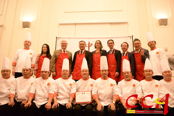 张平(后排左4)、托纳克(后排左3)、何梅(后排左2)与中国烹饪协会名厨团队合影