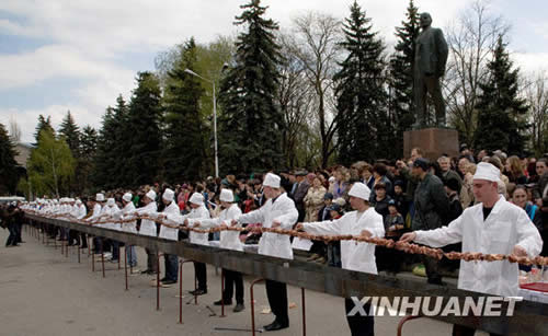 这是2009年4月25日,厨师们在俄罗斯联邦卡拉恰伊-切尔克斯共和国首府切尔克斯克展示一根120米长的烤肉串。新华社发