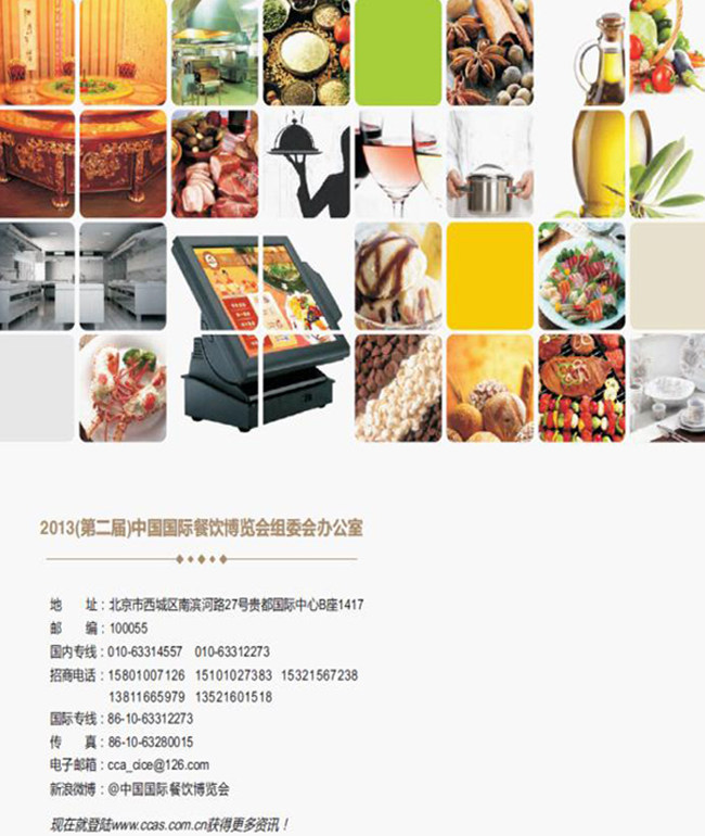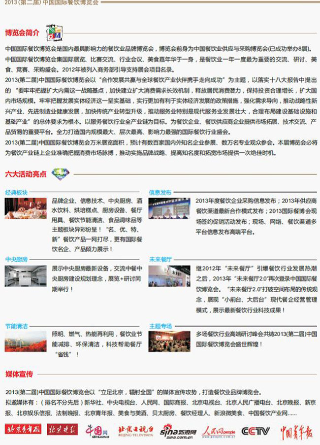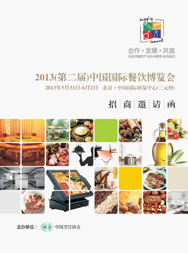 为落实十八大报告中提出的“要牢牢把握扩大内需这一战略基点,加快建立扩大消费需求长效机制,释放居民消费潜力,保持投资合理增长,扩大国内市场规模。牢牢把握发展实体经济这一坚实基础,实行更加有利于实体经济发展的政策措施,强化需求导向,推动战略性新兴产业、先进制造业健康发展,加快传统产业转型升级,推动服务业特别是现代服务业发展壮大,合理布局建设基础设施和基础产业。”总体要求,积极响应商务部《关于“十二五”期间促进餐饮业科学发展的指导意见》。由中国烹饪协会主办的“2013(第二届)中国国际餐饮博览会”(简称“2013国际餐博会”)定于2013年5月31日至6月2日在北京·中国国际展览中心(三元桥)举办。