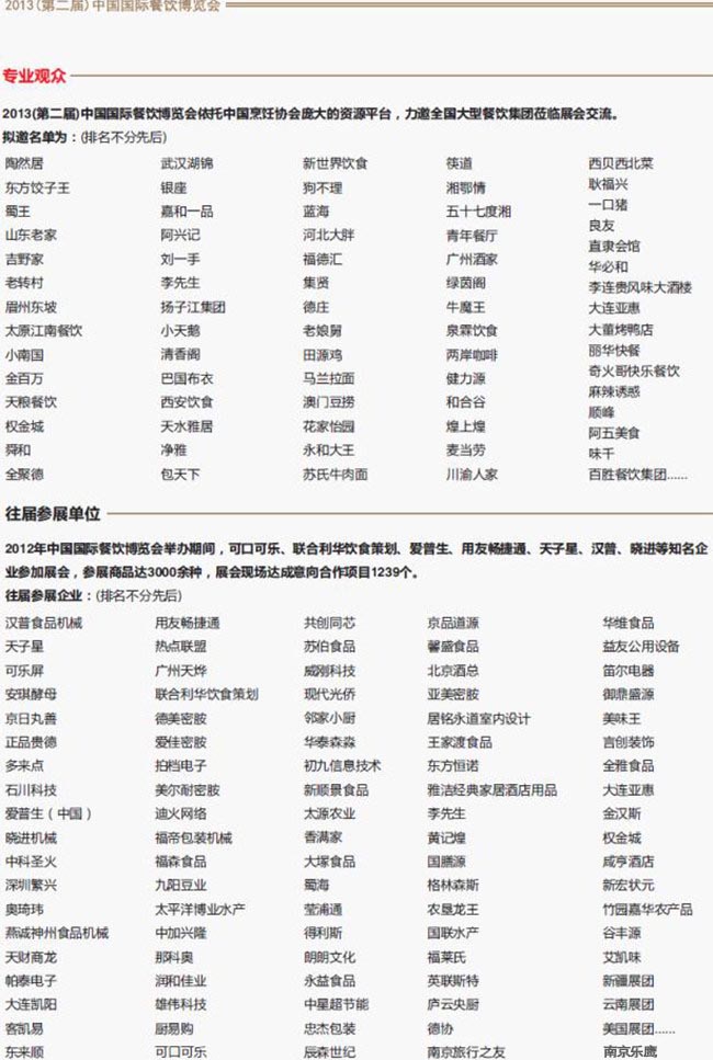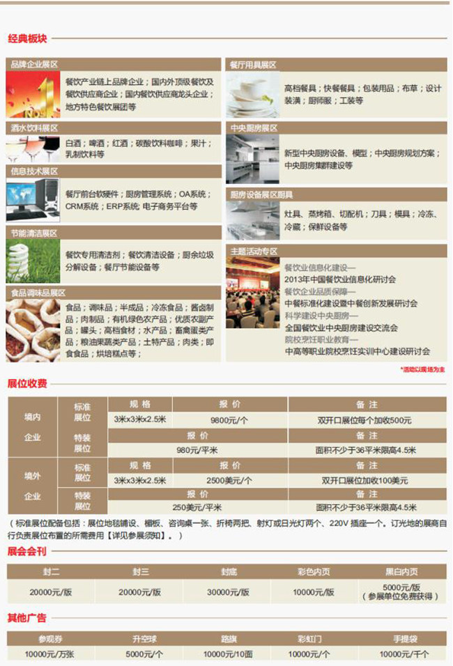 2013国际餐博会以服务餐饮业全产业链为目标,为餐饮企业、餐饮供应商提供市场拓展、技术交流、产品贸易的重要平台,全力打造国内规模最大、层次最高、影响力最强的国际餐饮业盛会,为餐饮产业链上企业准确把握消费市场脉搏,实施品牌战略、提高知名度和拓宽市场创造契机。2013国际餐博会将提供万平米展览面积,搭建品牌企业、信息技术、中央厨房、酒水饮料、烘培糕点、厨房设备、餐厅用具、餐饮节能清洁、食品、原辅材料、调味品、酒水饮料、连锁加盟等主题板块,并将针对餐饮业信息化建设、中央厨房建设、中餐创新及标准化建设、餐饮职业教育实训中心建设等重点议题展开交流研讨,同时开设2013年度餐饮企业采购信息发布、2013年供应商餐饮渠道最新合作模式发布、2013国际餐博会现场签约促销活动发布平台。
