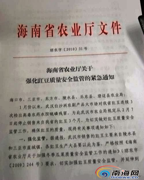 22日上午,南海网记者在武汉市发给省农业厅的检测报告上看到,豇豆每公斤农药残留为0.14—0.17毫克,主要成分是水胺硫磷。