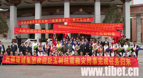 4月30日下午16:10我们回到了拉萨,自治区商务厅马相村厅长率全体干部职工以及四家企业的董事长、总经理和员工400多人,在商务厅办公大楼前举行了盛大的欢迎仪式,马厅长亲自为赴灾区的所有队员戴上了洁白的哈达,并送上鲜花。对我们此次赴玉树灾区所做的工作给予了充分的肯定,并合影留念。之后,各企业及媒体也纷纷为我们敬献哈达,互抢镜头,现场气氛非常热烈……