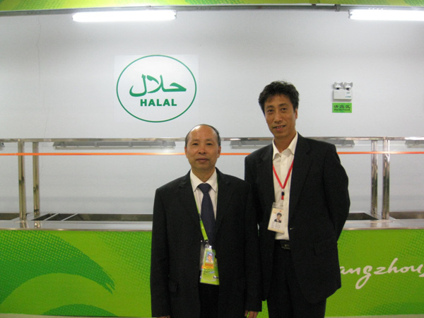 张慈贤主任(左)与清真专委会副秘书长、亚运会清真餐饮团队领队张文才(右)合影