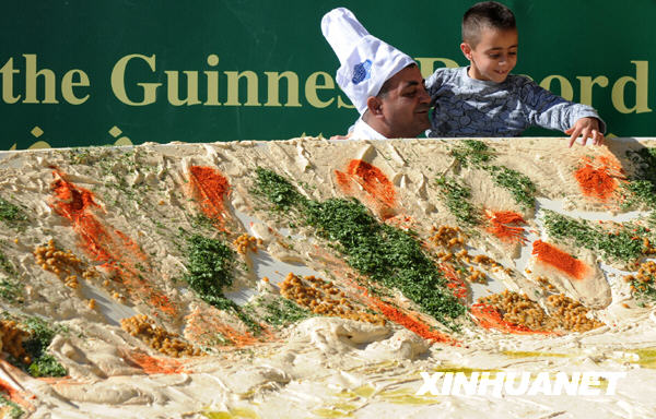 据此间媒体8日报道,这份胡姆斯酱的原料总重达4087公斤,包括鹰嘴豆、芝麻酱、大蒜、橄榄油和柠檬汁,制成后装在一个直径6米的大盘子里。它比此前吉尼斯世界纪录中最大的胡姆斯酱重将近一倍。此前纪录由黎巴嫩厨师于2009年10月创造。