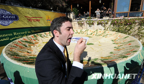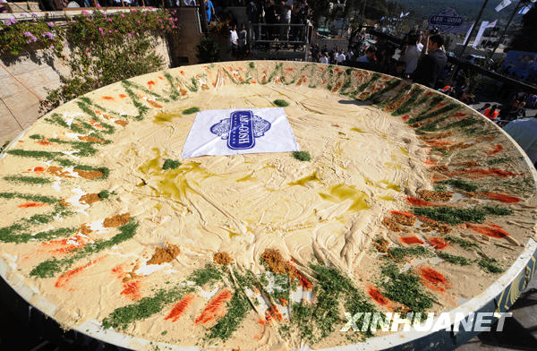 50名以色列厨师8日在耶路撒冷附近村庄阿布告什制成了一份世界最大的胡姆斯酱,并当场获得吉尼斯世界纪录认证。