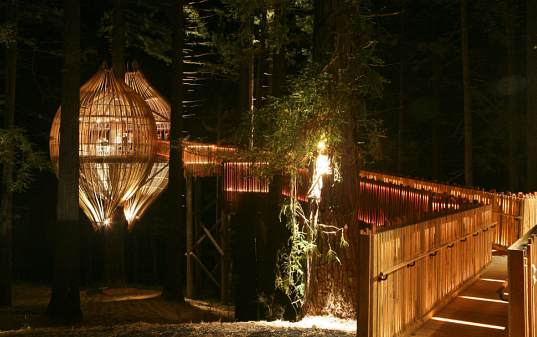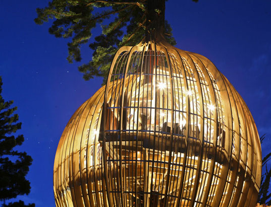 这间木质小屋建在一棵坚固的松树上,距离地面40米高,外型看起来就像一只蚕茧的外壳。小屋建在红木树森林的边上,四周的板条是用白杨木制作而成,还有红木制成的栏杆。它的通道是由一个低角度的厚木板支起的,这不仅保证了顾客出入小屋的安全,更便于坐在轮椅中的顾客通行。坐在这间木质的饭店小屋中,放眼望去会看见辽阔的草坪和流淌的小河,太阳光会恰到好处地直射进小屋里,暖暖的照在身上,这是何等的惬意。