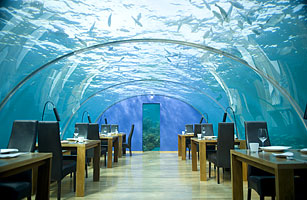 海鲜爱好者们不用学会游泳就可以在马尔代夫的餐厅中享受海底世界的美妙。在印度洋底5米处的一个珊瑚礁上,穿过木质的走道,然后往下走几步台阶,你就会看到6个华丽的餐桌,每个餐桌只能坐两个人。有幸在此享受大餐的人们,可以透过玻璃观赏外面的珊瑚礁和海鱼。Ithaa在当地语言中是“明珠”的意思,人们在此用餐,就好像置身于鱼缸内,而鱼就在外面看着你。对于那些担心Ithaa安全性的游客而言,2005年4月的海啸已经证明了这家餐厅坚如磐石——在那次灾难中它毫发无损。