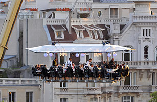 四年前,一家比利时公司把美食带向了新的高度以提升他们公司的竞争力,确切的说,是提高了50米。餐厅用130吨的起重机将餐桌升上高空,显然这并不适合恐高症患者,但是对于那些喜爱新奇的饕客来说,在城市上空享受世界一流厨师的厨艺无疑是一件妙不可言的事情,其中甚至有米其林三星级名厨。尽管用明火烹饪的食物是在地上完成的,不过空中餐桌的中央有可以容纳三个厨师的空间,他们会来对美食做最后的处理。天空晚餐在30多个国家都存在,不过要吃这顿晚餐,你除了有钱还得有时间,因为光升上去就得花费两个小时哦。