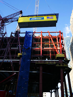 赛百味在纽约有很多专营店,不过这最新的一家可能要算是纽约海拔最高的一家了。它目前在一座楼的27层,这栋楼曾经是世贸中心的遗址,现在成为了一栋新摩天大楼的建筑工地。赛百味就在这个建设项目的顶楼,好像一个豆荚一样,内置四个移动的液压推轮,让工人们在货物集装箱内用餐。这个由DCM工人建造的“豆荚”,具有非常神奇的功能,它能在两个塔式起重机和钢筋格子之间自由起落,并且能够随着楼层的增高一直往上升,直到最后105层的高度。这个主营三明治的商店有着很容易被认出的鲜黄色和深绿色标志。店主希望提升菜单上经典纽约快餐的价格——汉堡、热狗、椒盐脆饼,还有一些意大利美食,如烤宽面条、披萨。他认为建筑工人会喜爱这些加价之后更大份的食物。