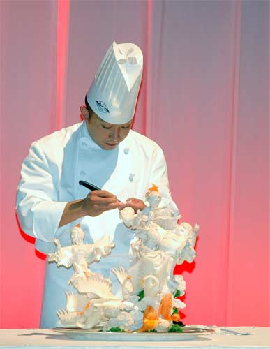 在开幕式现场,中国厨师现场亲手展示了高超的技艺:细如发丝的龙须面,用芋头、萝卜刻就的雕塑,令人折服。