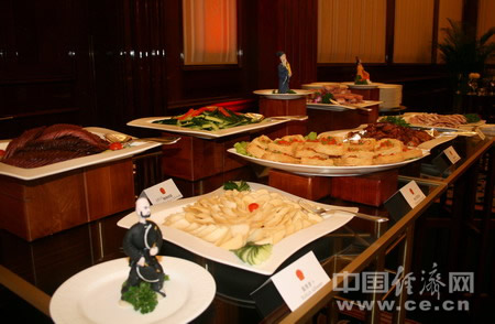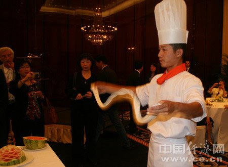 来自江苏省镇江市的四位高级厨师把精心准备的菜肴奉献给来宾的同时,还现场表演了刀工,切豆腐,切出的豆腐放在水里,宛如一棵盛开的菊花。还有拉面。拉出的面又长又细,宛如头发丝。另外还把西瓜雕刻成一朵美丽的牡丹花。来宾们对厨师的表演惊叹不已,报之以掌声,并纷纷拍照留念。丽思·卡尔顿饭店的总经理盛赞中国的烹调艺术和餐饮文化,认为中华厨艺在柏林的展示有益于加强中德两国文化的交流。