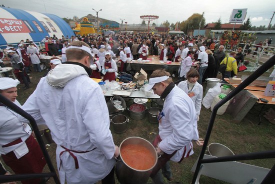 10月2日,在乌克兰首都基辅郊区举行的国际农业展览会上,这里烹饪出的巨型红菜汤创造了新的世界纪录,该国厨师在5000升的巨型汤锅里煮了4000升红菜汤,其中汤里放了250公斤白菜、90公斤洋葱、80公斤胡萝卜、140公斤豆子和27公斤盐。