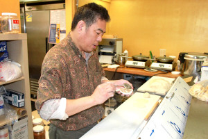 侨报记者在一个周末的午后拜访了“老谷”,虽然已经过了午餐时间,但光顾的民众还是络绎不绝。因为大部分面食都是顾客点了之后由他现场制作,所以老谷一直在厨房里忙碌着,同时也练就了他极快的操作速度,不出一分钟,4个水煎包已经在煎锅里啪啪作响了。