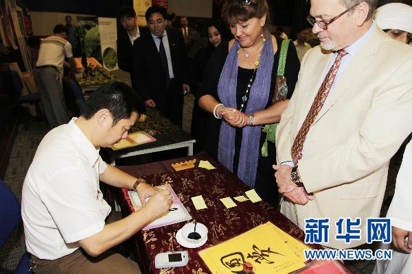 旅阿华侨童琪先生的书法表演人气高涨,大学师生们排着长队等候童先生为他们挥毫泼墨,他们都希望把自己的名字用中文写在宣纸上作为永久的留念,更有一些大学生聚拢在示范如何使用筷子的中国老师面前,一遍又一遍地练习挟豆子。