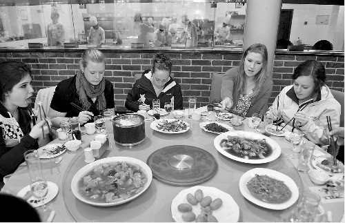 很快,到中午吃饭的时间了。鱼香肉丝、宫保鸡丁、蒜泥白肉……各种传统川菜菜品陆续上桌。看得出,大家都不是第一次吃中餐,舞动起筷子来都有模有样。