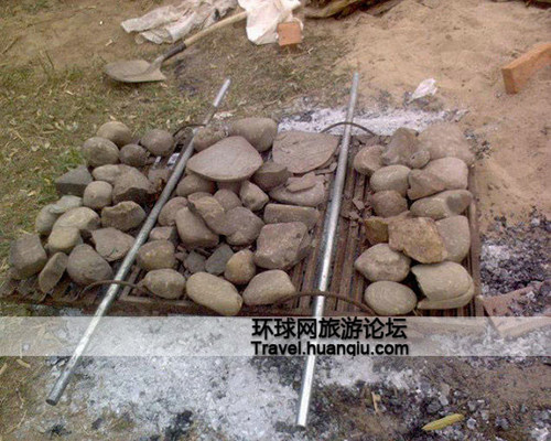 第二个坑中架着铁壁,上面堆满了大大小小的卵石,坑底也铺了一层卵石,坑中的炭火烧烤着上下的卵石,师傅们还不时用一束束天然香料植物拍打着卵石。赫苏斯老人告诉记者,石头已经烤了4个多小时了。