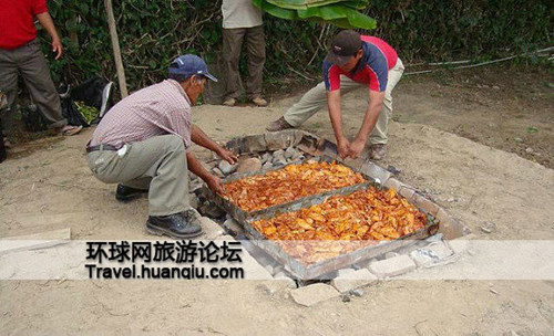 原料码放完毕,原来凹陷的大坑已成了一个鼓起的“小山包”。师傅们在“山包”上面铺上芭蕉叶、树叶和一个厚厚的大苫布,最后再盖上一层泥土。赫苏斯说,个把钟头后,400多人就可以分享这道以大地为锅制作的大餐了。他说着又拿起一节细甘蔗,劈成两半,做成一个十字架插在“小山包”顶,又插了一束鲜花——赫苏斯解释:秘鲁山民以此表达对大地母亲的感恩之情。