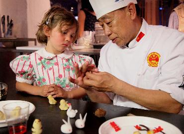 5月8日,在比利时布鲁塞尔美食节上,来自北京饭店的国家高级面点师王春耕向一个女孩演示造型面点的制作。