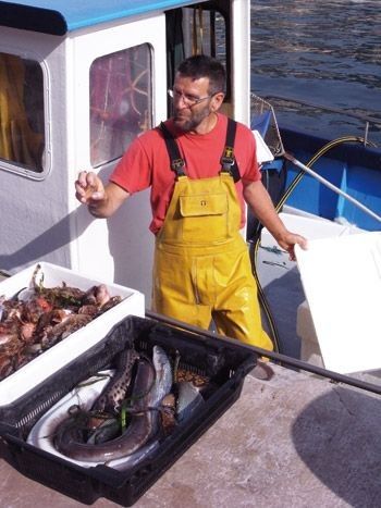 早上8点左右,我们一直等待的Lulou号的主人驾船回来了。他慢慢地把船驶近摩纳哥港口固定的位置,系好绳子,取出水龙头,开始进行冲洗。 Mr.Lulou是一个脸色红润、身材高大的中年人。上身穿着件红色的T恤,身上围着防水的黄色围裙,脚上是一双黑色的雨鞋。他家是摩纳哥目前所剩的唯一以捕鱼为生的家庭,家族中从事这份工作还有他的弟弟和儿子。