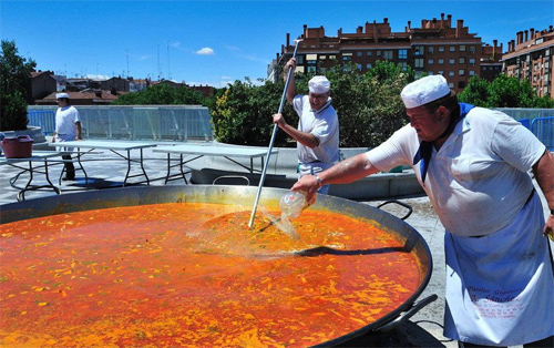 西班牙马德里市比利亚韦德区在当地夏季传统节日期间举办“千人海鲜饭”活动。图为一名厨师(右)向锅内倒入调料。