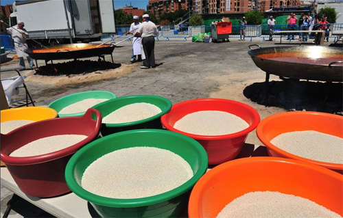 西班牙马德里市比利亚韦德区在当地夏季传统节日期间举办“千人海鲜饭”活动,众多民众免费品尝了由专业厨师使用巨型平底锅烹制的西班牙特色食品——海鲜饭。图为人们准备用于烹制海鲜饭的大米。