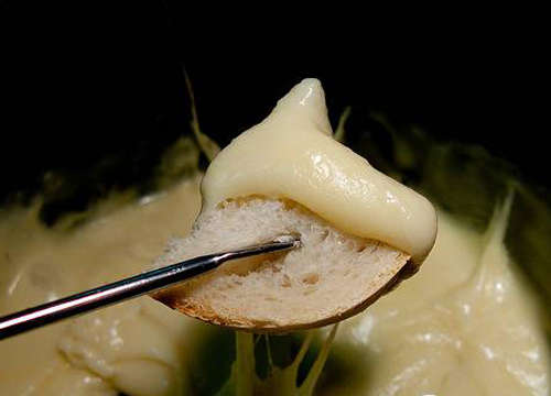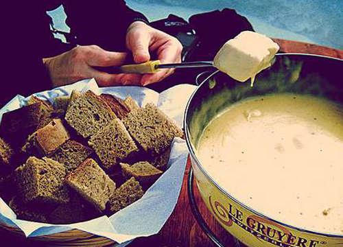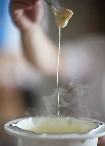 “奶酪火锅”是瑞士最普遍、最具盛名的火锅之一。瑞士人制作“奶酪火锅”一般都是先以蒜涂抹于锅底,再将不同口味的硬奶酪擦成碎末放入锅中加热成糊状,再加淀粉、白葡萄酒、大蒜、奶油等,继续煮并慢慢搅拌至完全融化呈浓浓的炼乳状,最后放进一些黑胡椒即可。上桌后,人们用长柄叉子叉着切成四五厘米见方的“法式长棍面包”蘸着奶酪吃,很像中国的“拔丝香蕉”。