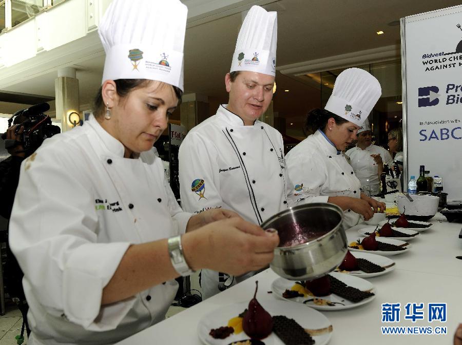 8月24日,在南非的约翰内斯堡,来自南非的厨师在南非世界厨师反饥饿之旅活动上展示厨艺。来自44个国家的200多名厨师于8月21日抵达南非,参加在南非为期10天的世界厨师反饥饿之旅烹饪旅行活动,为处于饥饿困境中的人们筹集资金。