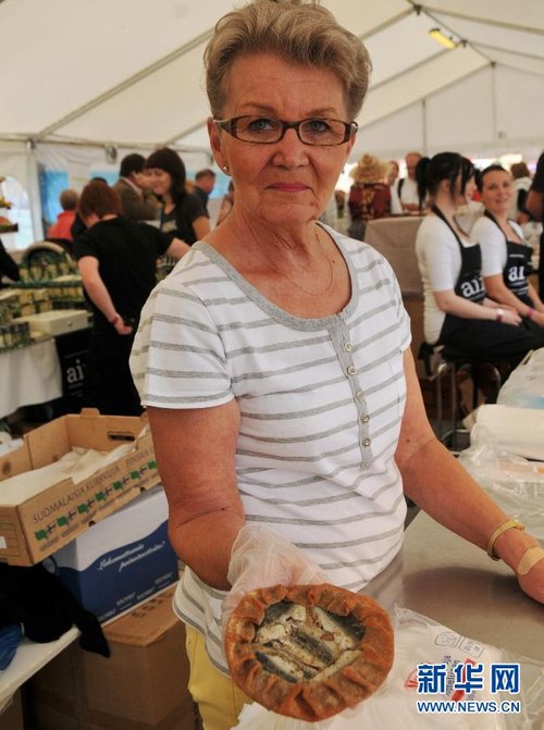8月26日,在首届芬兰美食节上,厨师展示她制作的鱼肉馅饼。这种馅饼里排放着数条小鱼,吃起来柔软多汁,味道极为鲜美。