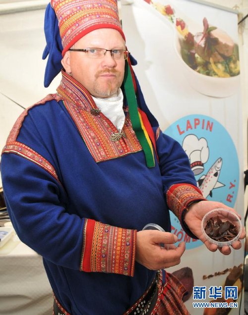 8月26日,在首届芬兰美食节上,身穿芬兰北部当地民族服装的销售人员向人们介绍最富地域特色的驯鹿肉干。