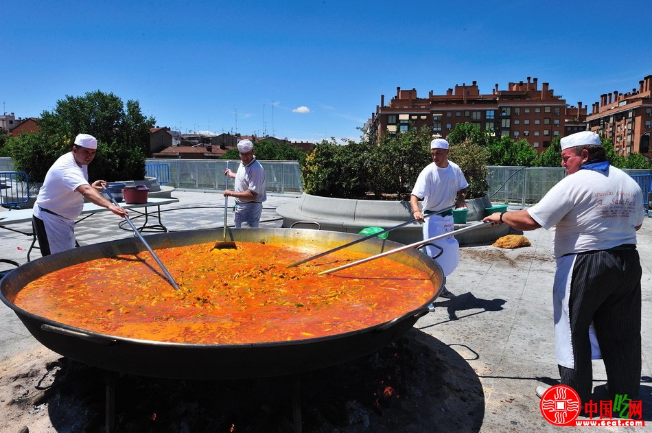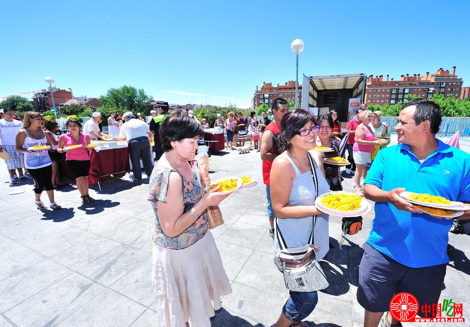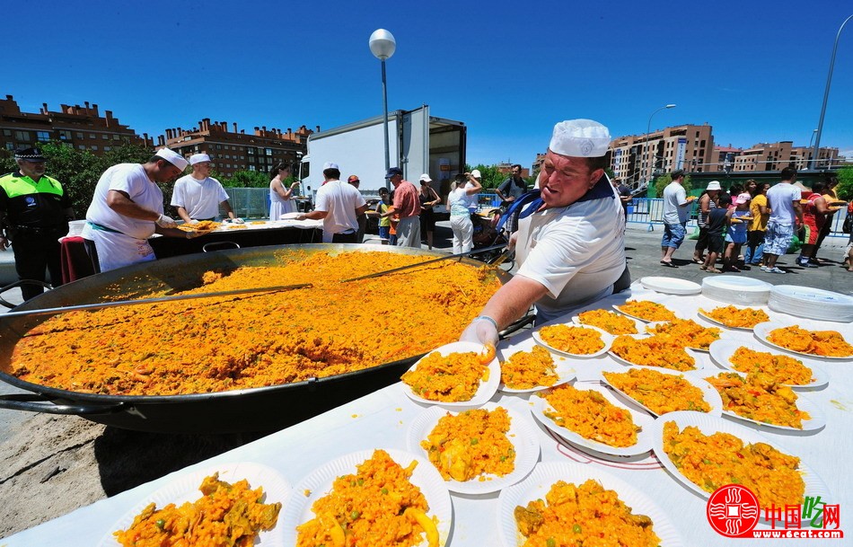 西班牙马德里市比利亚韦德区在当地夏季传统节日期间举办“千人海鲜饭”活动,众多民众免费品尝了由专业厨师使用巨型平底锅烹制的西班牙特色食品——海鲜饭。