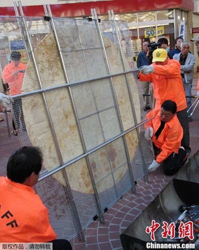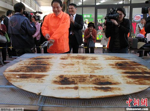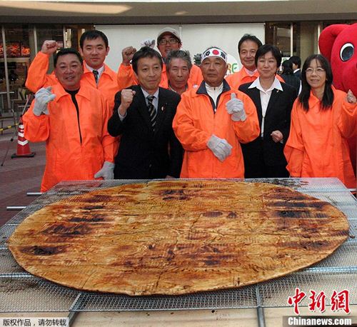 11月16日,日本千叶,人们站在直径1.63米的米饼前。如果该米饼通过吉尼斯世界纪录委员会审核,将成为首个申请吉尼斯纪录的世界最大米饼。
