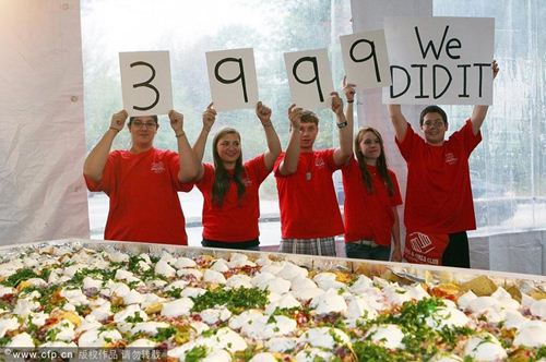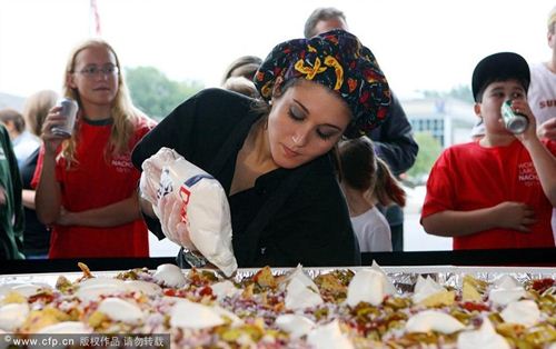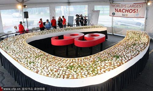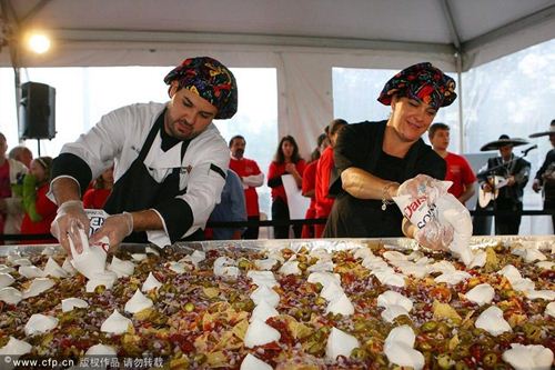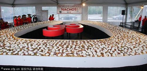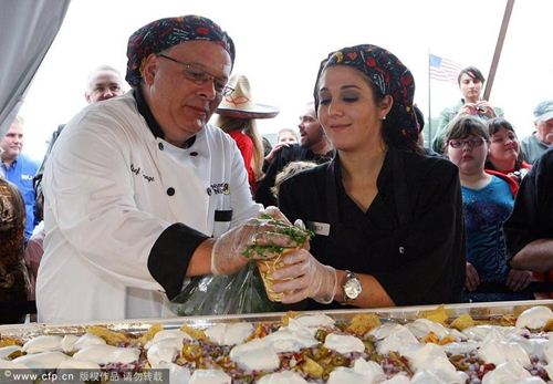 美国马萨诸塞州比尔里卡,99餐厅(Ninety Nine Restaurants)的工作人员做出了一份重达3999磅的墨西哥风味烤玉米片,创造了世界最大烤玉米片吉尼斯纪录。厨师将最后的材料摆放在即将完成的烤干酪玉米片上。