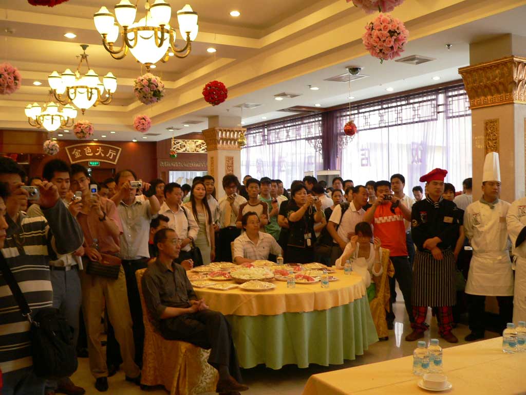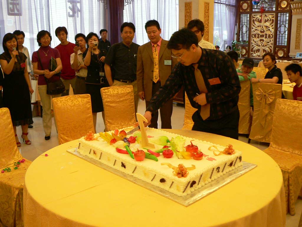 北京吉诺高面包房为了庆祝中国西餐网成立一周年特为活动制作了巨型的蛋糕表示祝贺,来宾共同为庆祝中国西餐网一周岁生日分享了蛋糕。