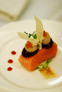 油浸三文鱼及澳洲带子伴鲟鱼子Oil-steep Salmon and Australian Scallops with Sturgeon Caviar