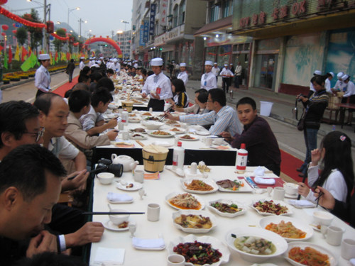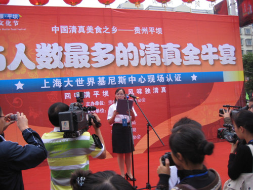 上海大世界基尼斯认证中心见证了600多名来宾共享全牛宴,宴席摆桌近200米长。这一惊人举动,就是 2008年9月29日在贵州平坝县举办的首届中国安顺平坝清真饮食文化节上,呈现在世人面前的一副动人的画面。