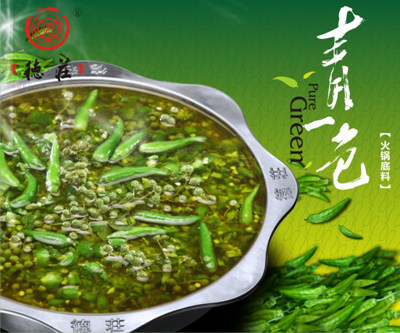 红汤、红油、红辣椒,百年重庆火锅一直以来固定不变的符号,近日出现了新面孔——由德庄集团创新研制的,新型麻辣火锅底料"青一色"底料,6月27日闪耀登场。该底料选用重庆石柱无公害辣椒基地种植的朝天椒鲜青辣椒和重庆四面山优质的九叶青青花椒为原料,将传统方法与科学相结合,炒制出重庆火锅的精典底料,填补了用新鲜原材料生产火锅底料的空白,开创了火锅底料的新纪元。该产品从色香味方面,给予人们新鲜、绿色、健康、味美的全新感觉。