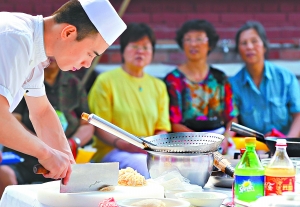 “‘芫爆散丹’的牛百叶要用鸡汤煨”、“‘醋熘木须’的醋要临出锅再放”……老字号“烤肉宛”的副厨师长、市级烹饪大师谢磊日前在西长安街社区为百余位居民现场演示、传授“名店名菜”的制作技艺。西城区的“名厨进社区,教你学厨艺”活动已经连办两年,作为什刹海文化旅游节和“西城消费嘉年华”的一项活动,将健康美食文化带进了居民生活。承办活动的西城区饮食行业协会副会长夏爱东介绍,该会有800余家西城的餐饮老字号、名店和特色餐馆,这些餐馆的厨师都可来到身边的社区、居民院,传授名菜的制作技艺。