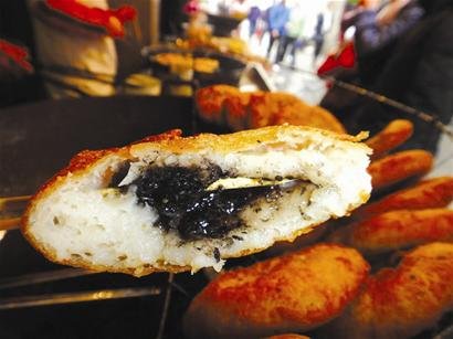 近日,记者在户部巷叶老瘪饼店看到,刚炸出来的油香油汪汪的,外表扁圆、金黄酥脆。店主老叶介绍,这馅里可是包含了黑芝麻蓉、花生碎、蜂蜜、桂花和白砂糖等不少好东西,“吃起来外脆里嫩”。