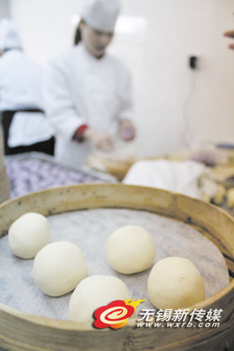 记者看到,厨房间里现场做的糕点有桂花年糕、紫薯球、南瓜球、小笼包、秋叶包、麦青团、拉糕等近20个品种,以前老无锡俗称“三凤桥月饼”的慎馀梅贡饼也已经恢复。临近过年,由于中央厨房做的点心要同时配供三凤桥的几家分店,现在又开了外卖柜台,所以每天做的糕点量要比平常增长好几倍。而这家老字号的所有糕团都是手工制作,因此很多糕点制作师傅工作量都非常大。