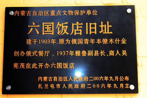 在内蒙古自治区扎兰屯市布特哈北路有一家历史悠久的百年老店,至今已有107年历史,该店是扎兰屯首家俄式餐厅,由俄国人本僚木什金1905年创办。饭店建筑外观属中俄结合式结构,当时在中东铁路沿线颇为有名。1940年商人吴宪茂承接此餐厅并命名为六国饭店; 1946年内蒙古人民自卫军骑兵5师建立之后,司令部一直设在六国饭店,在这里曾指挥大规模剿匪活动和支前运动。六国饭店长期以来得到社会各界的高度关注,具有很高的行业历史地位和独具魅力的文化价值。