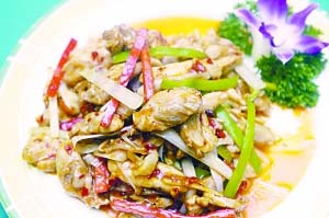 这里的油爆河虾做法十分精细,取每斤85只的鲜河虾,洗净后,剪去须脚,入油锅爆炒,色泽红亮,粒粒饱满,壳脆肉嫩,咸中带甜。还有精扣三丝,用火腿、鸡肉、冬笋切成见方不过1.5毫米、长约80毫米的细丝,三色相间,口味鲜香,入口滑爽,清淡嫩软。
