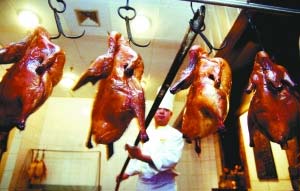 全聚德是挂炉烤鸭的代表。从一只活蹦乱跳的北京鸭到一盘红亮酥脆的全聚德烤鸭,这中间需要28道工序。出炉的鸭子形态饱满,外皮烤成均匀、透亮的枣红色,象绸布一样光洁漂亮。一只刚出炉的油亮的烤鸭被放在鸭车上推到食客的面前,大师傅手持片鸭刀,上下翻飞,一片片柳叶般大小的鸭片整整齐齐地码在盘内,这种表演,在满足食客的味觉之前,先给人以视觉上的快感。