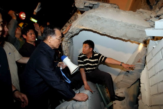 5月12日,中共中央政治局常委、国务院总理温家宝抵达地震灾区四川省都江堰市,指挥抗震救灾工作。