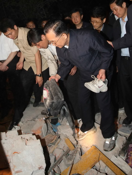 这是温家宝从都江堰市一所学校的废墟中捡起学生的鞋子和书包,心情沉重。