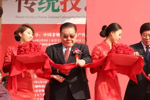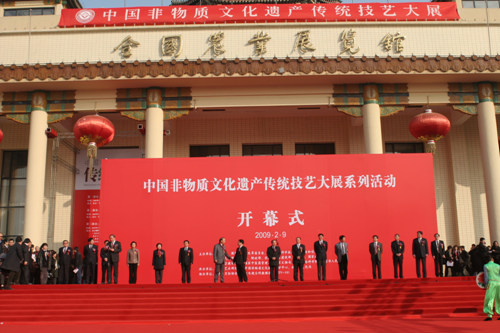 中国非物质文化遗产传统技艺大展系列活动于正月十五(2月9日)在北京农业展览馆开幕。这是新中国成立60年以来,特别是最近几年来,中国非物质文化遗产保护工作成果的一次集中展示,是规模最大、种类最全的一次传统技艺大展,1176位民间艺人将参与其中,2322件珍贵实物将与世人见面。全国人大常委会副委员长司马义·铁力瓦尔地、全国政协副主席白立忱、文化部部长蔡武和中国烹饪协会会长苏秋成等领导出席开幕式并为大展活动剪彩。