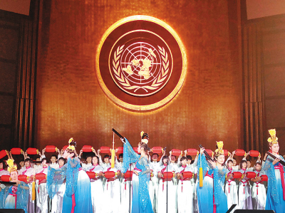 2月1日晚,“中国非物质文化遗产展演”在美国纽约联合国总部举行。图为福建泉州五中表演的歌舞(南音)《正月闹元宵》。